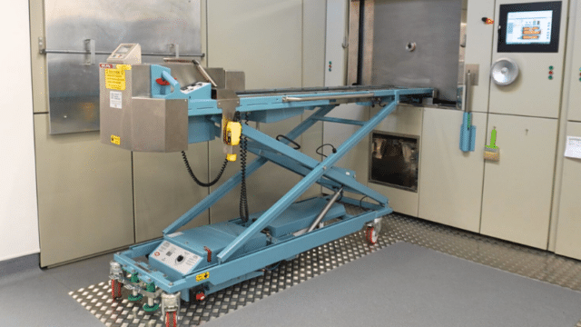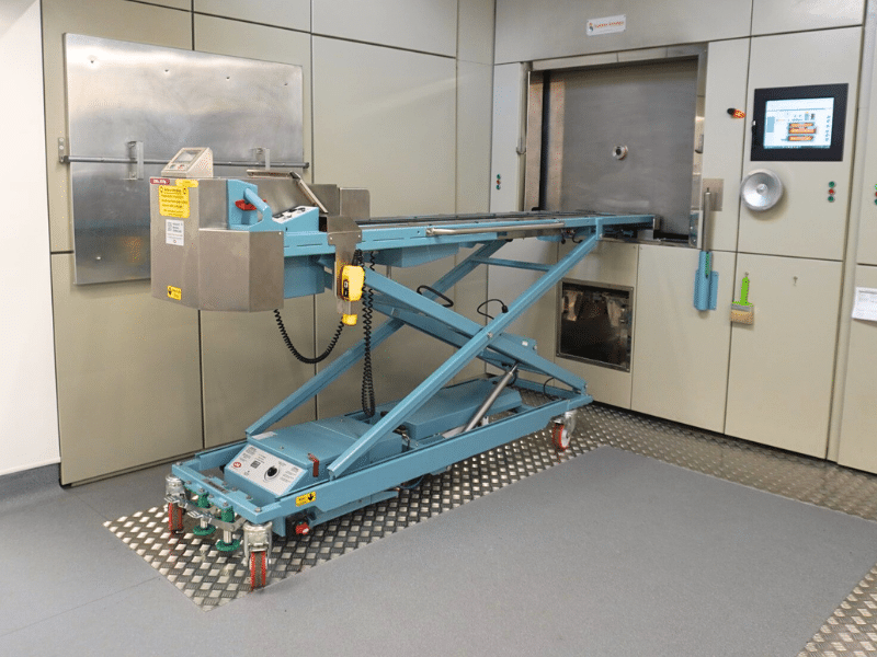 The LEEC Kompact X Cremator Charger allowed the coffin to be taken directly from the rear of the cremator in one movement, without the need for additional manual handling, as is frequently the case for settings equipped with fixed chargers. The substantial construction and powerful traction drive provided ease of movement and precise manoeuvrability for the operator. This model is specifically designed to physically support the operator as well as improve dignity for the deceased. The simple operation ensures that it’s suitability for use even when being viewed directly by the public, in the case of witnessed cremation, as required by some religions.