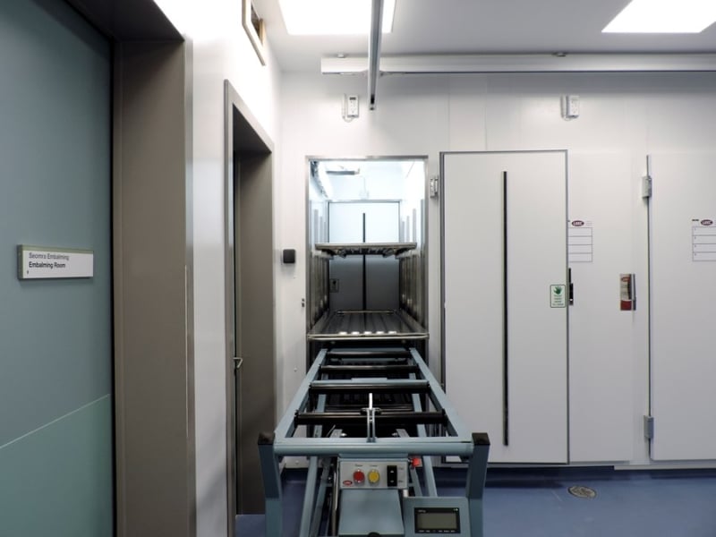 The body is placed on a body tray on entry to the facility and then is transferred into the refrigerated body storage racking. The body will remain on the same tray throughout all of the required procedures with any transfers being completed through the use of a LEEC trolley. From having this system, it removes as much manual handling as possible, protecting the staff and enabling in many cases, single-user operation.